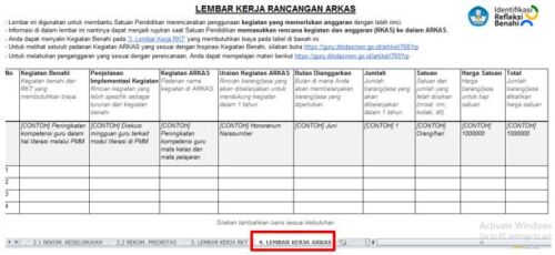 - Isi kolom Kegiatan ARKAS pada sheet 4 Lembar Kerja ARKAS dengan nama yang paling sesuai dari daftar kegiatan di platform ARKAS.