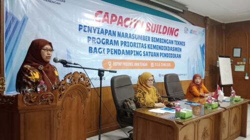 Semarang – BBPMP Provinsi Jawa Tengah menyelenggarakan kegiatan Capacity Building (CB) Penyiapan Narasumber Bimbingan Teknis (Bimtek) Program Prioritas Kemendikdasmen bagi Pendamping Satuan Pendidikan selama tiga hari, mulai Rabu, 21 Mei 2025 hingga Jumat, 23 Mei 2025. Kegiatan ini bertujuan untuk menyiapkan bahan, materi, dan narasumber Bimtek bagi Pendamping Satuan Pendidikan agar siap mendampingi implementasi program prioritas Kemendikdasmen di satuan pendidikan.