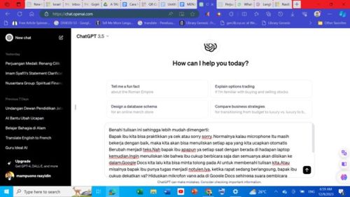 Bapak ibu kita bisa praktikkan ya cek atau sorry sorry. Normalnya kalau microphone itu masih bekerja dengan baik, maka kita akan bisa menuliskan setiap apa yang kita ucapkan otomatis  Berubah menjadi teks.Nah bapak ibu apapun ya setiap saat dengan berada di hadapan laptop kemudian.Ingin menuliskan ide bahwa ibu cukup berbicara saja dan semuanya akan diisikan ke dalam.Google Docs kita lalu kita bisa minta tolong pada AI untuk membenahi tulisan kita.Atau misalnya bapak ibu punya tugas menjadi notulen.Iya, ketika rapat sedang berlangsung, bapak ibu cukup dekatkan ya? Hidupkan mikrofon yang ada di Google Docs sehingga suara pembicara langsung berubah menjadi teks setelah teks yang banyak itu terkumpul misalnya.2 jam.Itu kan teksnya banyak sekali.Biarlah AI yang mensortir.Tapi bapak ibu tahu kapasitas AI itu jumlah karakter yang dimasukkan di sana ada batasnya. Jadi misalnya nih tulisan ada 12 halaman yang 4 halaman masuk 4 halaman masuk 4 halaman masuk supaya diedit.Dan direvisi oleh AI.Ya.Dalam hal ini yang paling sering penulis gunakan adalah chatGPT. Ya.