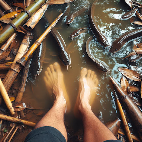 Dengan cepat, aku mengambil ember besar dan mulai memasukkan ikan-ikan itu ke dalamnya. Tangan-tanganku yang sudah terlatih tak perlu berpikir dua kali saat menangkap belut yang licin. Ah, belut itu seperti kenangan masa lalu yang sulit kupegang, selalu licin dan berusaha lepas. Tapi kali ini, aku sudah tahu cara menjepitnya. Tanganku merangkul mereka dengan cerdik, seperti seorang petarung yang tahu persis kapan harus menyerang.