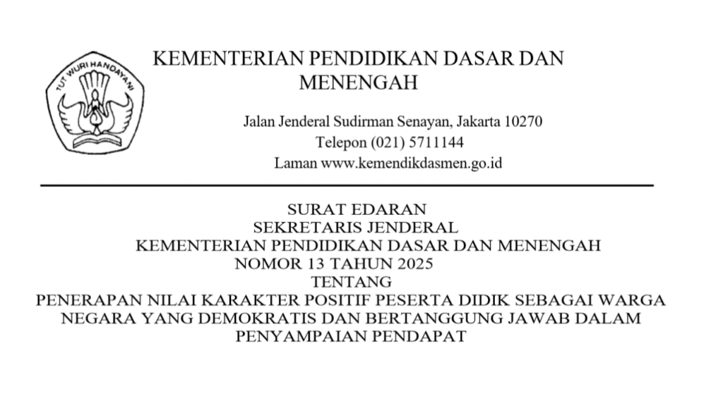 Edaran yang ditandatangani Sekretaris Jenderal Kemendikdasmen, Suharti, ini menegaskan pentingnya pembinaan karakter peserta didik dalam menyalurkan pendapat secara santun, aman, dan sesuai dengan nilai demokrasi. Hal tersebut sejalan dengan amanat Undang-Undang Nomor 20 Tahun 2003 tentang Sistem Pendidikan Nasional, yang menekankan agar pendidikan mampu melahirkan warga negara yang beriman, berakhlak mulia, cakap, kreatif, mandiri, serta bertanggung jawab.