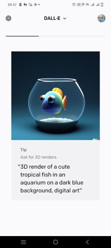 Gambar 2: Dengan instruksi “3D Render of a cute tropical fish in an aquarium on a dark blue background. Digital Art” maka DALL-E memprosesnya menjadi gambar unik seperti di atas.