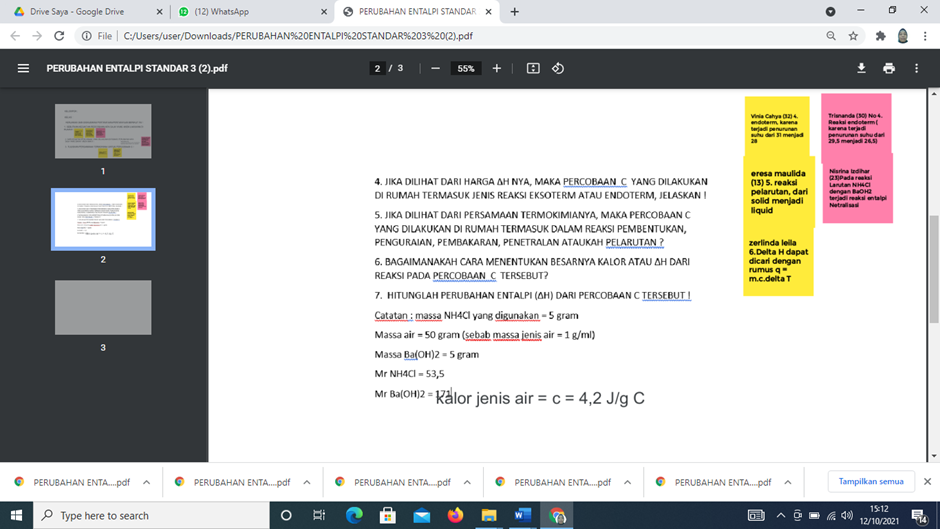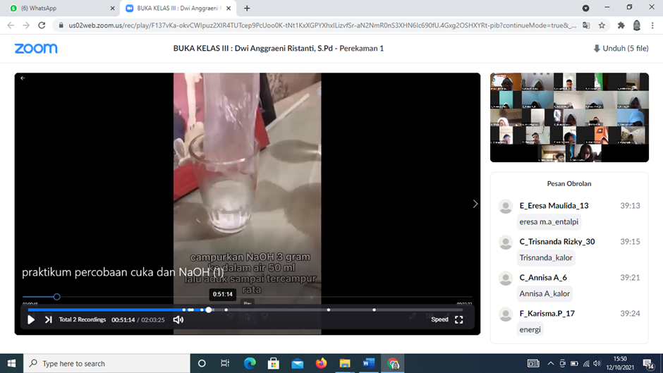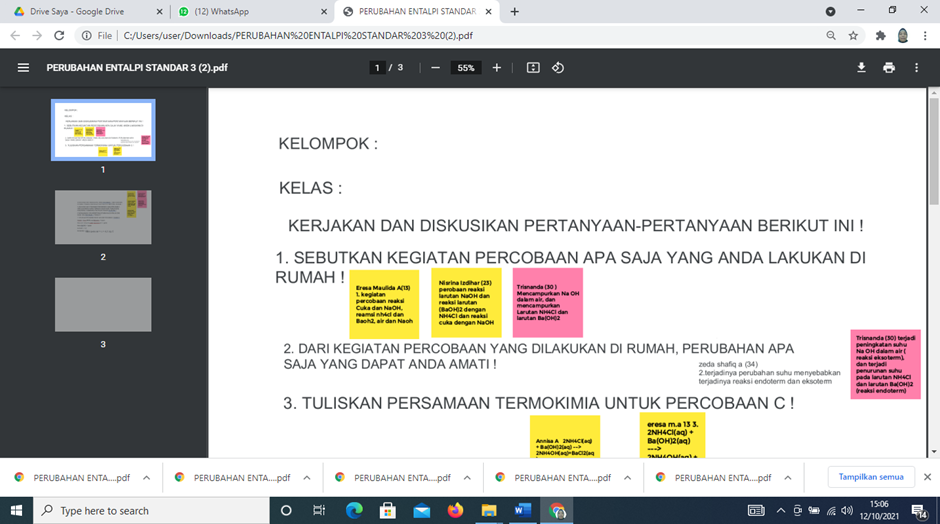 Pada pembelajaran berikutnya yaitu materi macam-macam perubahan entalpi standar, guru mulai memadukan penggunaan media “Jamboard” dengan praktikum yang dilakukan oleh setiap perwakilan kelompok di rumah mereka masing-masing. Setelah beberapa peserta didik melakukan praktikum tentang macam-macam perubahan entalpi standar ini, mereka kemudian berkolaborasi di dalam breakout room yang sudah disiapkan untuk masing-masing kelompok. Tugas para peserta didik ini di dalam breakout room adalah membahas praktikum yang telah dilakukan oleh temannya terkait dengan materi serta berdiskusi memecahkan masalah yang guru berikan melalui media “Jamboard”.