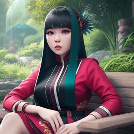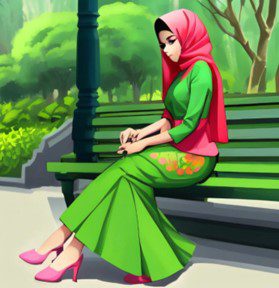 - Prompt 2: Gambar ilustrasi wanita yang sedang duduk di taman dengan latar belakang pemandangan pepohonan hijau yang rimbun, mengenakan pakaian elegan dengan atasan dan bawahan kombinasi warna merah dan hijau.