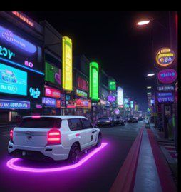 - Prompt 2: Sebuah mobil SUV baru sedang melaju di jalan raya yang dipenuhi lampu neon di malam hari dengan latar belakang kota metropolitan yang indah dan penuh kehidupan.