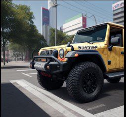- Prompt 3: Sebuah jip Rubicon baru sedang melaju di jalan raya di tengah kota.